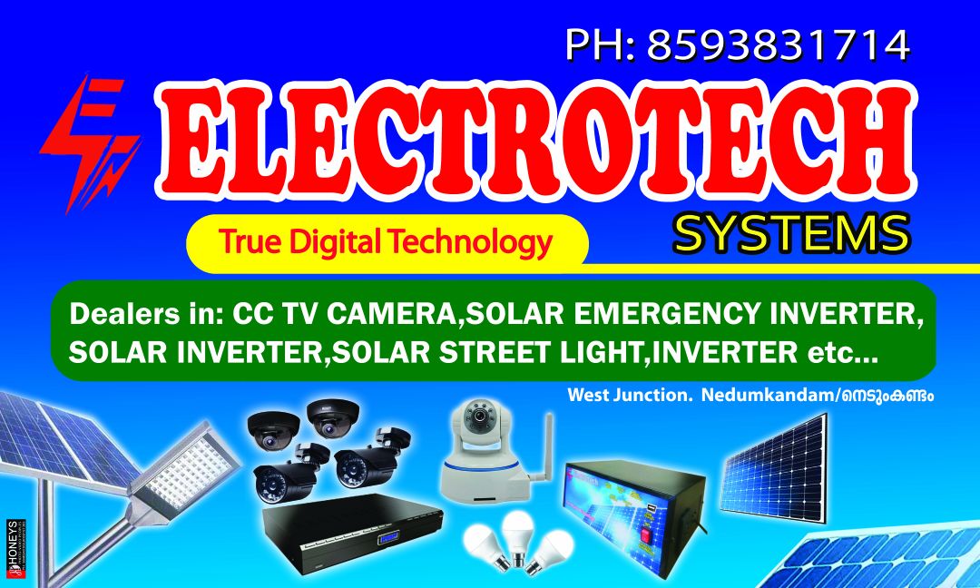 Located in Nedumkandam, Specilised in: CC TV Camera,Digital LED Board, Solar Emergency Inverter, Solar Inverter, Water Heater, Inverter................................View your world from anywhere ........anytime......