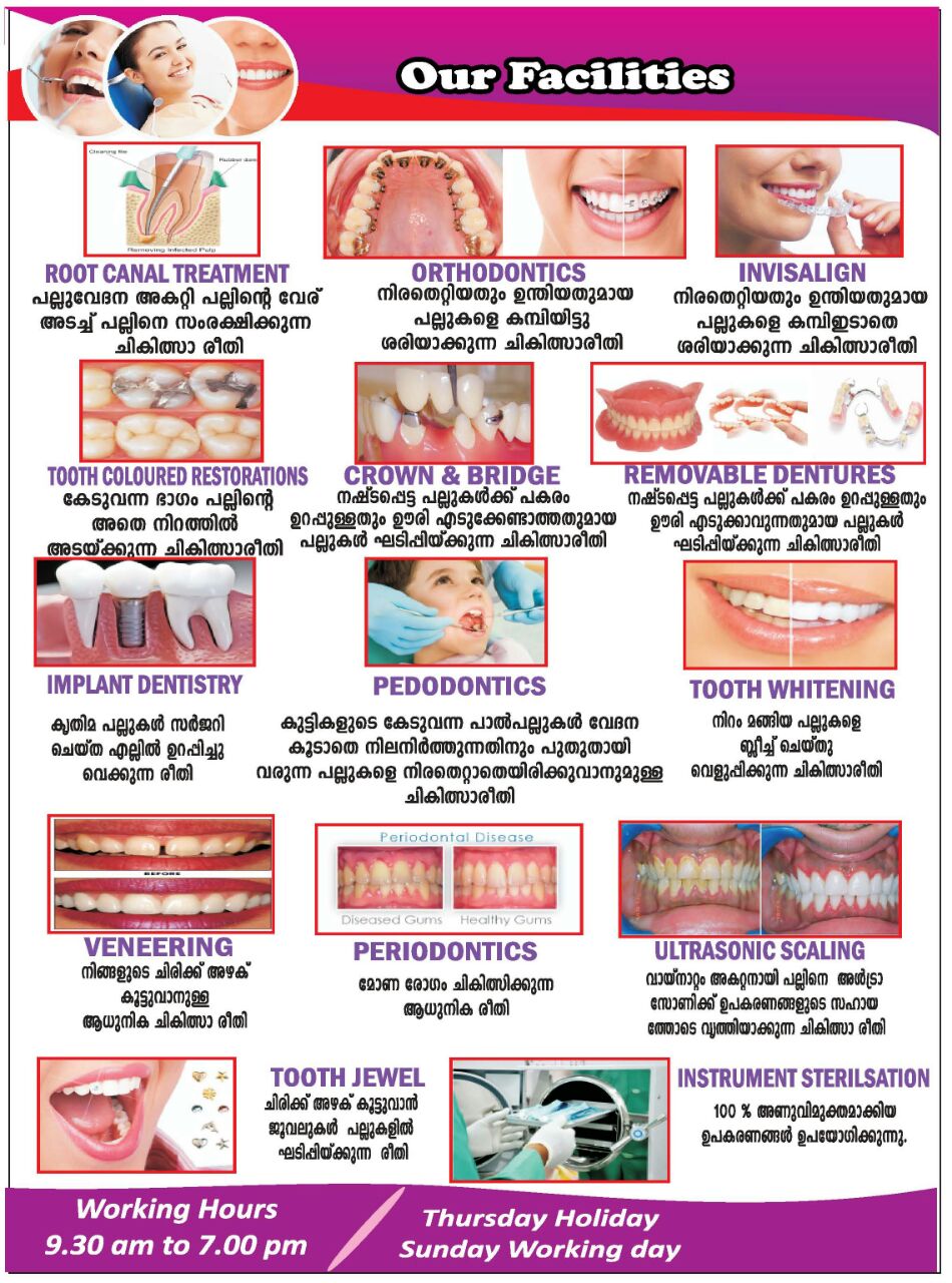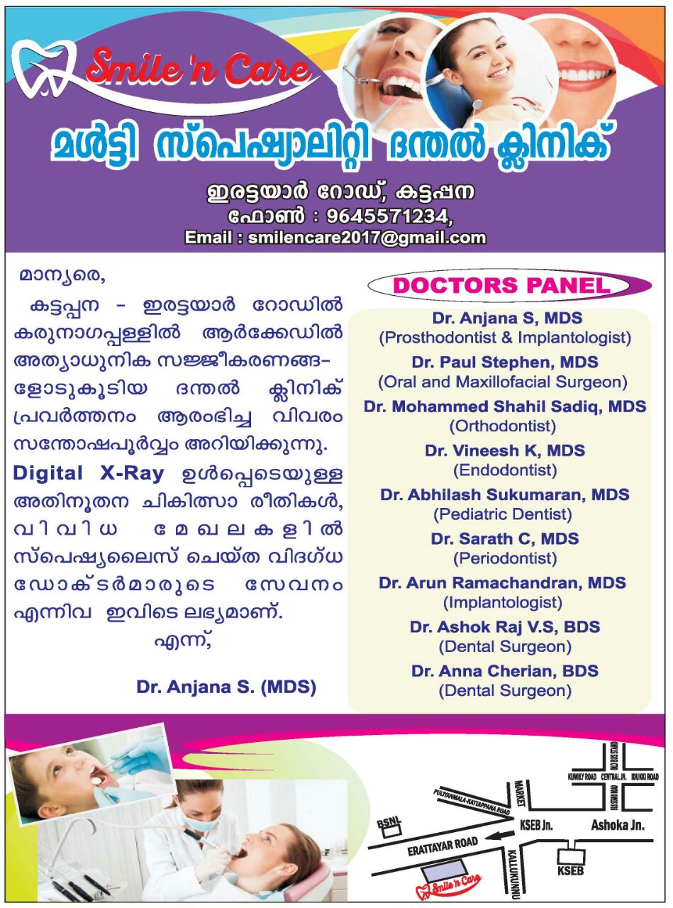 Located in Kattappana, Irattayar Road, Doctors Panel : Dr. Anjana. S (MDS, Prosthodontist & Implantologist), Dr. Paul Stephen (MDS, Oral & Maxilo Facial Surgen), Dr. Muhammed Shahil Sadiq (MDS, Orthodonist), Dr. Vineesh K (MDS Endodontist) Dr. Mithun Paul ( MDS, Endodontist), Dr. Abhilash Sukumaran (MDS, Pediatric Dentist), Dr. Sarath P (MDS Periodontist), Dr. Arun Ramachandran (MDS, Implantoloist), Dr. Ashok Raj VS (BDS, Dental Surgeon), Dr. Anna Cherian (BDS, Dental Surgeon)