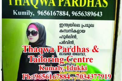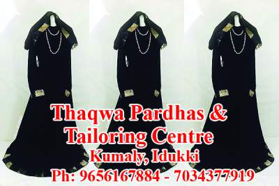 Located in Kumali - Specilised in: Indian Companys in Hurlin - Parwin - Mehar - Lamiya Thakwa - Phihaa - Almirra -Materials - Suite - Fancy Umbrella- Jeans Pardha - Gulf Pardha - Haj Pardha - Pardha Legins - Full Hand Nighty - Prayer Dress etc Thaqwa Pardhas & One Hour Ladys & kids Tailoring Center -Wessing Derss Designing - Emproidery - Glass Work - Stone Work - Lase Work