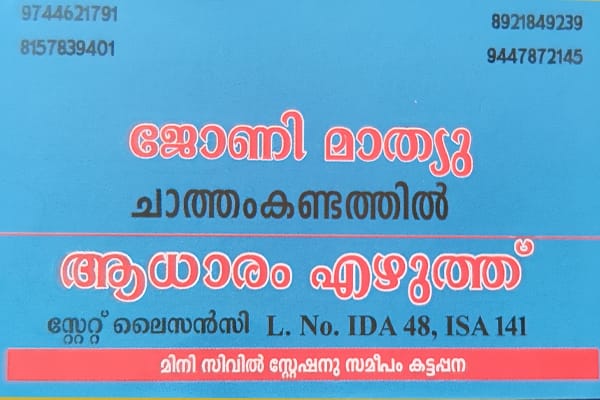 Located in Minicivilsatation Kattappana, Specialized in: Document Writter, Ph: 9744621791, 8157839401