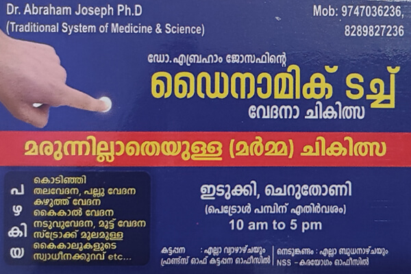 Located in Cheruthoni, Specialized in: Healing Pain Without Drugs: For Migrane, Headache, Toothache, Neck Pain, Hand and Leg Pain, Disabilities connected with stroke etc..