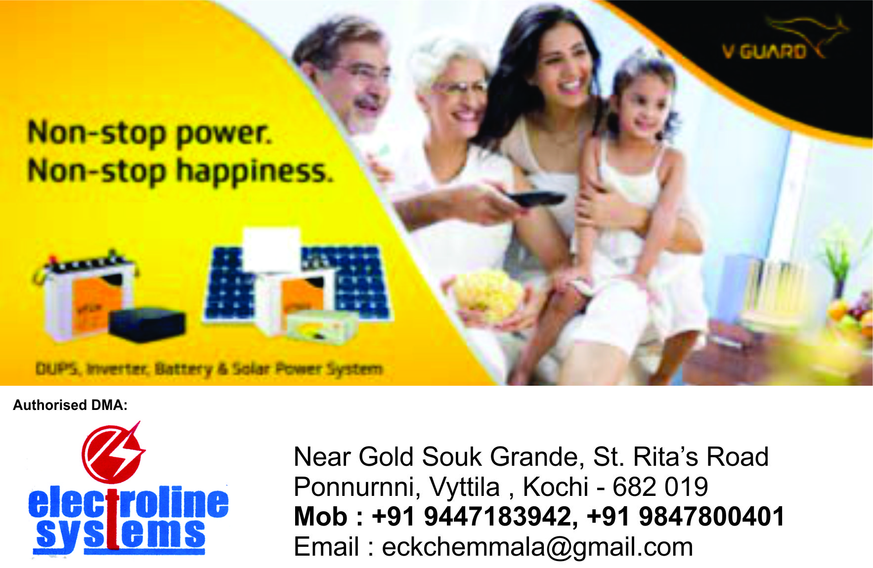CALL US :9447183942, 9847800401 ELECTROLINE SYSTEMS Near Gold Souk Grande St.Ritas Road,Ponnurnni Vyttila, Kochi – 682019 INVERTER Inverter Dealer In Ernakulam V guard Inverter Dealer in Ernakulam V guard Home UPS in Ernakulam V guard Inverter Dealers in Ernakulam V guard Home UPS Dealer in Ernakulam Home UPS Dealer in Ernakulam Home UPS Dealers in Ernakulam V guard Inverter Dealers in Ernakulam V guard Inverter Dealer UPS UPS Dealer in Ernakulam UPS Dealers in Ernakulam V guard UPS Dealer in Ernakulam Built in UPS for computer in Ernakulam Computer UPS Dealer in Ernakulam Computer UPS Dealers in Ernakulam V guard Built in UPS V guard UPS WATER HEATER Water Heater Dealer in Ernakulam Solar Water Heater Dealer in Ernakulam V guard instant Water Heater Dealer in Ernakulam V guard Storage Water Heater Dealer in Ernakulam V guard Water Heater Dealer in Ernakulam V guard Water Heater Dealers in Ernakulam SOLAR INVERTER Solar Inverter Dealer in Ernakulam Solar Inverter Dealers in Ernakulam V guard Solar Dealer in Ernakulam V guard Solar Dealers in Ernakulam BTTERY V guard Battery Dealer in Ernakulam Inverter Battery Dealer in Ernakulam V guard Battery Dealers in Ernakulam V guard Solar Inverter Dealer in Ernakulam V guard Solar Inverter Dealers in Ernakulam Ernakulam- Kochi-Cochin-Kunnukara-Eloor-Paravoor-Perumbavoor-Aluva-Kalamassery-Muvattupuzha-Kadavanthra-Vypeen-Edappally-Tripunithura-Pukkattupady-Kakkanadu-Pazhaganad-Kizhakambalam-Ponjassery- Mattancherry-Kaloor-M.G.Road-Broadway-Vyttila-Thevara-Palarivattom-Thopumpady -Kozhencherry-Kothamangalam- Kunnathunadu-Kakkanad-Nedumbassery-Cochin Airport-Puthenvelikkara-Varappuzha-Kalady-Amballur