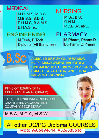 We are Medical,M.D, M.S, M.D.S, M.B.B.S, B.D.S, B.H.M.S, B.A.M.S, B.N.Y.S etc Nursing,M.SC, B.SC, G.N.M, P.C.B.Sc etc Engineering, M.Tec, B.Tec, Diploma (all Branches), Pharmacy, M. Phram,Pharm.D, B.Phram, D.Pharm B. Sc, Agriculture, Fashion Designing, Hotel Management, Radiology, Optrometry, M.L.T, Dyaliss, Perfusion Cardiac & Vascular, Anesthesia, Interior Designing, Physiotherapy (BPT), Speech & Hearing (BSALP) L.L.B Journalisam, Airhostess, Charted Accountant, Company Secretery M.B.A, M.C.A, M.S.W All Other UG/PG Diploma Courses