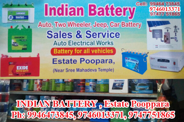 Located in Estate Pooppara, Specialized in: Auto, Two Wheeler, Jeep, Car Battery, Sales & Service, Ups Systems, Ph: 9500763644, 9746013371
