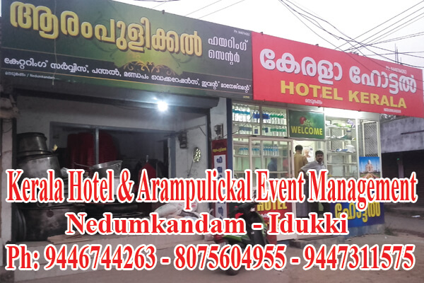 Located in Nedumkandam - Specilised in: Appam - Porotta - Dosa - Idiyappam - Meals - Biriyani - Snackes - Bief Curry - Bief Fry - Fish Curry - Fish Fry - Event Management - Decoration - Panthal - Hiring - Catering - Mandapam - Ph: 9447311575