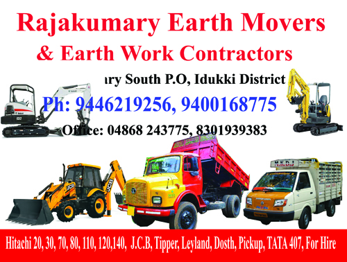 Located in Rajakumary, Specilised in: Hittachi 20, 30, 70, 80, 110, 120,140, J.C.B, Tipper, Leyland Dosth, Pickup, TATA 407, for Hire, Ph: 04868 243775, 8301939383