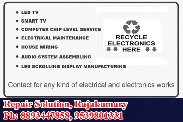 Located in Rajakumary, Specialized in: LCD, LED, Smart TV, Audio Systems, Computer, CCTV Installation. LED Scrolling Display, Computer Chip Level Service, Electrical Maintenance, House Wiring, Audio System Assembling, LED Scrolling Display Manufacturing, Contact for Any kind of electrical and electronics works