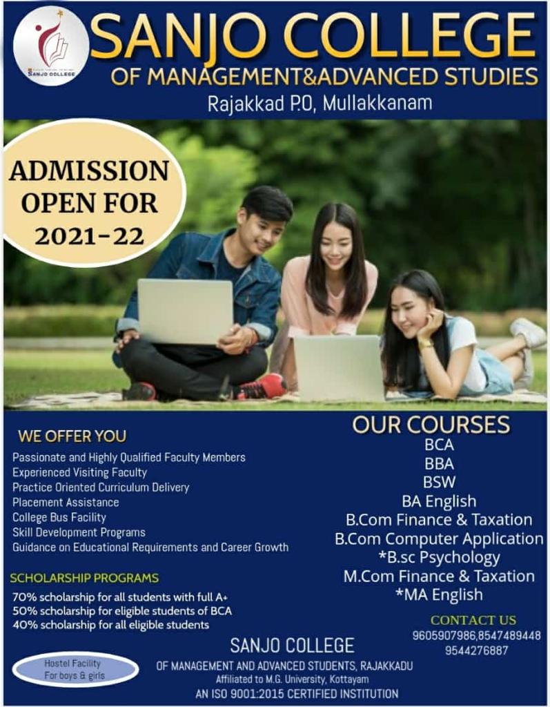 Located in Rajakkad, Mullackanam, Specialized in: A BEAUTIFUL STORY Sanjo College, Rajakkad is an Arts and Science College of Higher Education and Research managed by St. Joseph's Province of the Little Flower Congregation (CST Fathers) and is one of the new generation educational institutions with several most modern and job oriented university courses. It was started as a Private College in 2011 with the aim of providing higher education for the boys and girls of the hilly areas Rajakad and surrounding regions of Idukki district who do not have facilities to attend professional colleges. Taking the backward and underdeveloped situation of the high ranges into consideration, the M. G. University Kottayam granted official affiliation to Sanjo College in June 2013 on the basis of the sanction given by the Government of Kerala. God's blessing, and the hard of the CST Fathers has given this college a prominent status in the district. PRINCIPAL'S DESK It is with great honour and proud that I, on behalf of the faculty and staff, welcome you all to Sanjo College of Management and Advance Studies (SCMAS), a cradle of an academic.culture steeped in rich tradition and excellence. Sanjo College focuses on enabling students reach their full academic potential and caliber,developing discipline and moral character, and acquiring social confidence, to become responsible citizens of the country. Through various curricular and extracurricular opportunities provided, Sanjo College promises an exceptional quality learning experience for all students and ensures students embark upon new adventures in the world of wisdom. The highly skilled and dedicated faculty and staff at Sanjo College take their role as mentors very seriously, whereby they empower students to take responsibility for their own decisions, determine and form their own attitudes and opinions upon matters of life and society. We assist students to achieve academically and grow physically, socially and spiritually in a secure and student-friendly environment.I assure you that Sanjo College is a place worthy of your serious attention and consideration,and I welcome your interest in our exciting College. I invite all parents to be partners of this college to ensure success for each student. Have a great academic experience!