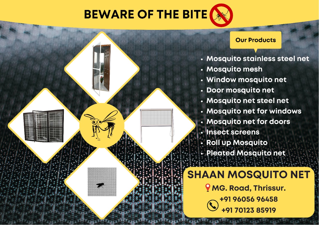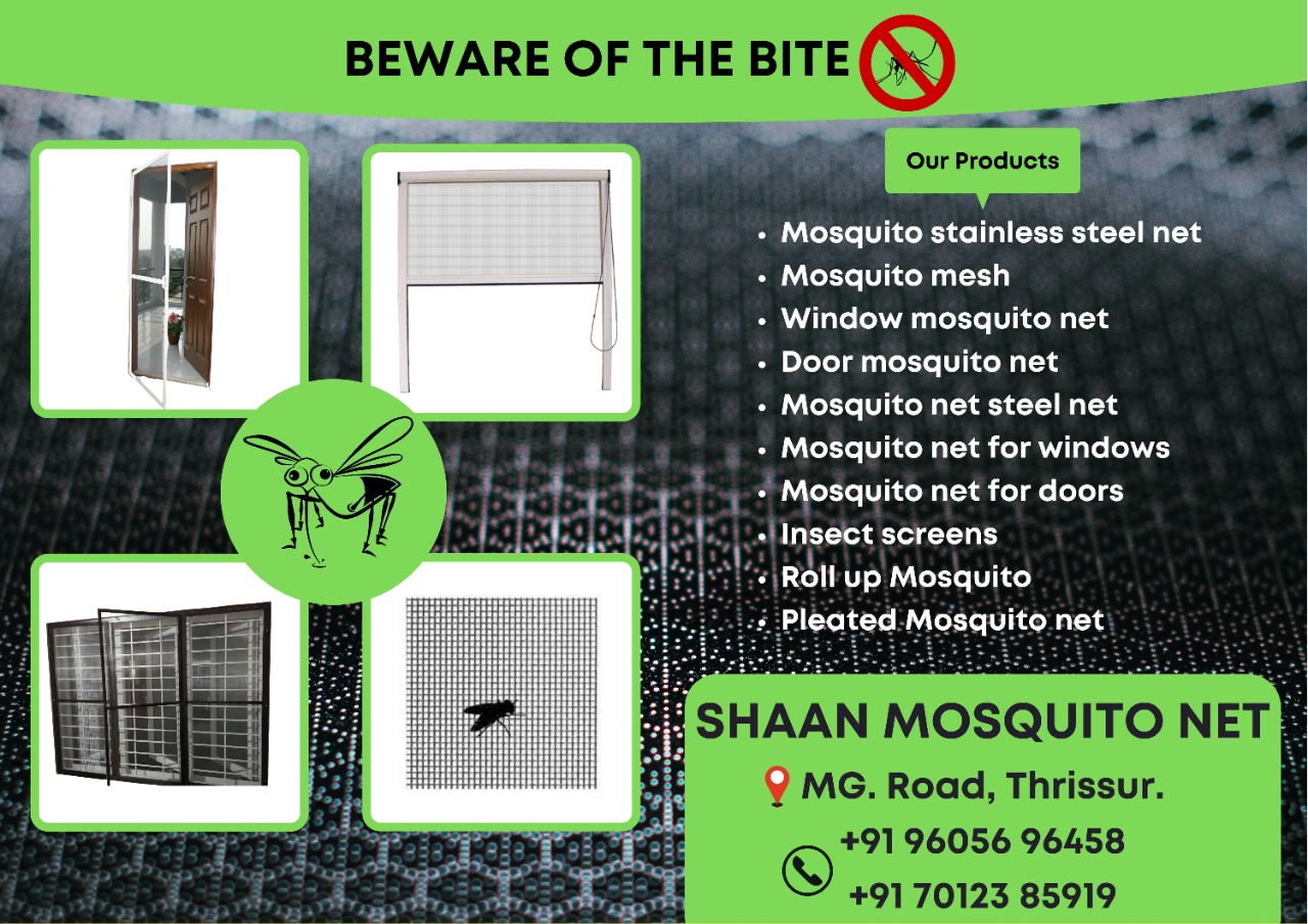 CALL: 9605696458, 7012385919 SHAAN MOSQUITO NET MG. Road, Thrissur Key word:- Mosquito net thrissur Mosquito stainless steel net thrissur Mosquito mesh thrissur Netlow thrisssur Window mosquito net thrissur Door mosquito net thrissur Mosquito net steel thrissur Mosquito net for windows thrissur Mosquito net for doors thrissur Insect screens thrissur Mosquito net fabrication thrissur Roll up Mosquito net thrissur Pleated Mosquito net thrissur Service Place: Thrissur ,guruvayoor,kunnamkulam,chavakkad,ollur,mannuthy,pavaratty,kechery
