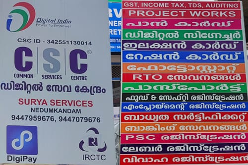 Located in Nedumkandam, Specialized in: Income Tax GST, Registration, Return Filling, TDS, Digital Signature, Accounts & Book Keepping, Project Work, E - Way Bill, Passport: New, Renewal, Error Refilling, Voter ID: New, Duplicate, Error Refilling, Pan Card: New, Duplicate, Error Refilling, Food & Safety: Licence & Registration, Labour Department: Registration Renewal, Panjayath Office: Birth, Deth Certificate, Marriage Certificate, Ownership Certificate, Property Tax, Village Office Certificates, Registration Department: EC, Special Marreage Registration, Motor Vehicle Department: Tax, Camera Fine, Ration Card: New, Renewal, Changing, Employement Exchange: Registration, Renewal, Certificate Ads, Students Service: E Grand Scholership, Pre Metric Scholership, Post Metric Scholership, Merit cum Means Scholership, OBC Scholership, Kerala Nursing & Mid wife Registration, SSC, UPSC, NET, NEET, BANKNDA, ARMY, NAVY & AIR FORCE Application, Registration, Banking: Account Opening UBI, JLG Paid, Money Transfer, Balance Checking, Deposits, Insurance: Vehicle, Health, Life Insurance, Pention: Prime Minister Kisan Mandaan Yojana, Sram Yogi Mandaan Yojana, Marchant Pention, NPS, Social Safty Pention, Photostate, Colour Print, Lamination, DTP, E Mail, Scan, Ph: 04868 233204