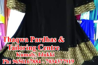 Located in Kumali - Specilised in: Indian Companys in Hurlin - Parwin - Mehar - Lamiya Thakwa - Phihaa - Almirra -Materials - Suite - Fancy Umbrella- Jeans Pardha - Gulf Pardha - Haj Pardha - Pardha Legins - Full Hand Nighty - Prayer Dress etc Thaqwa Pardhas & One Hour Ladys & kids Tailoring Center -Wessing Derss Designing - Emproidery - Glass Work - Stone Work - Lase Work