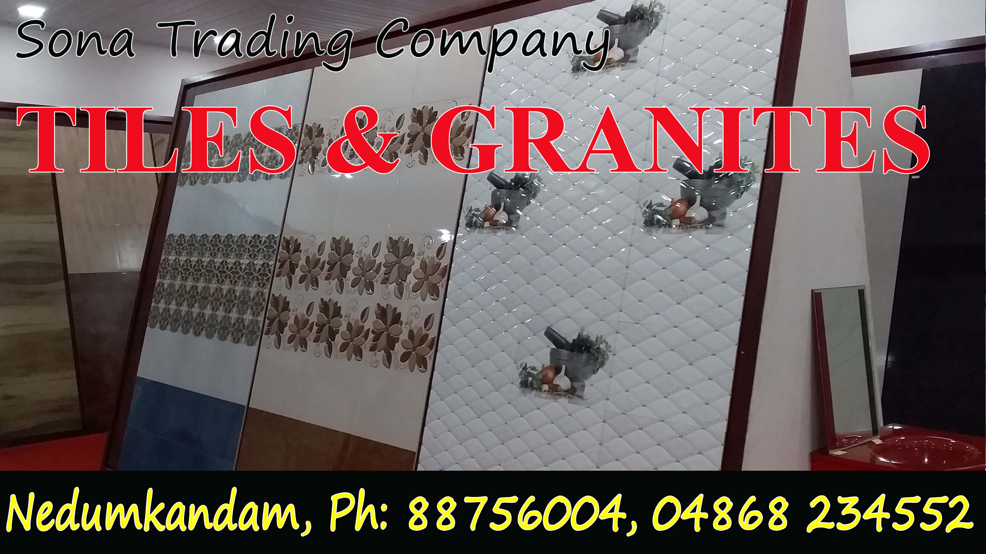 At a Glance : Located in Nedumkandam, Specilised in: Vitrified Tiles, Digital Tiles, Bathroom Tiles, Kitchen Tiles, Porch Tiles, Wall Tiles, Cladding Tiles, Ceramic Tiles, Anti - skid tiles, Granites, Kitchen sink, Sanitaries